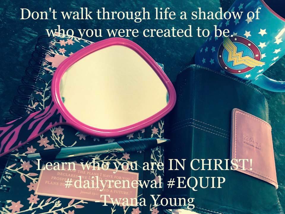 “Do not let your thoughts be shaped by how the world says you should think, what you should do, and who you can be. Be careful to not be made in the image of the world, instead of the image of God. Educate yourself about what the word of God says about you that is where you will find your true identity.” – Twana Young, Author EQUIP: A Journey of Personal Reflection, Transformation, and Hope
