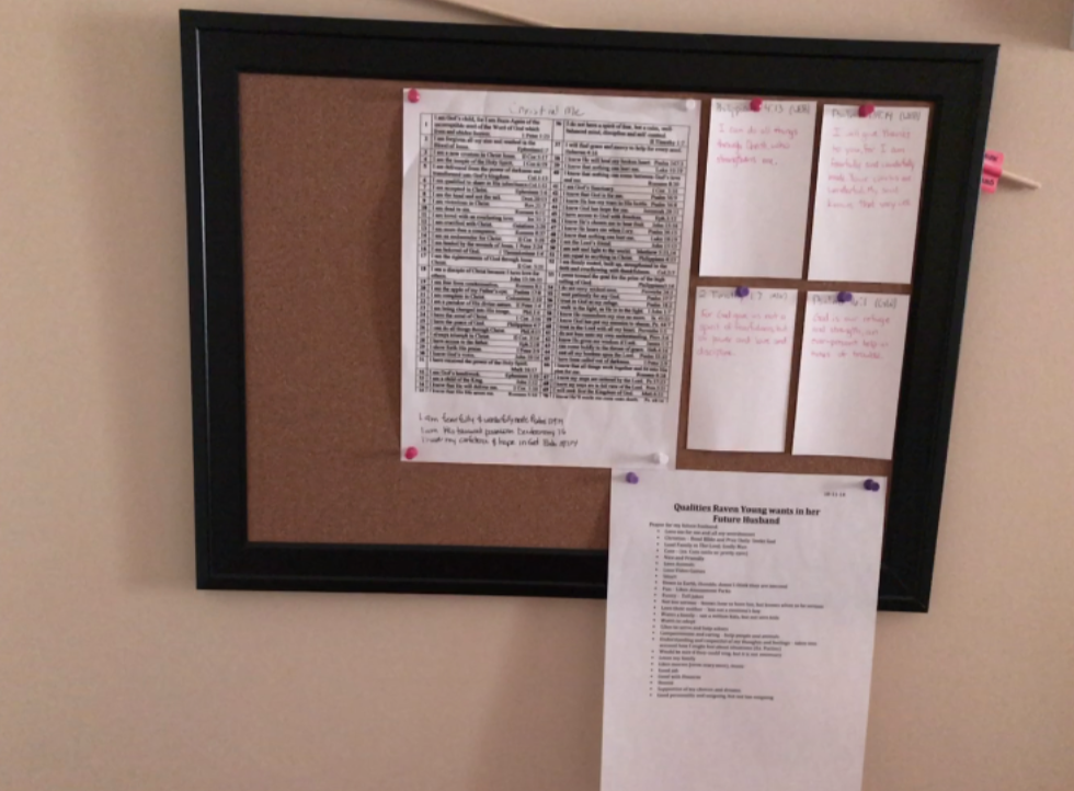 Hi, my name is Raven I am 18 years old and this is my prayer wall. It contains bible verses that I am praying over; declarations that I make to myself reminding me of who God says I am and a list of the qualities I am praying for in my future husband.